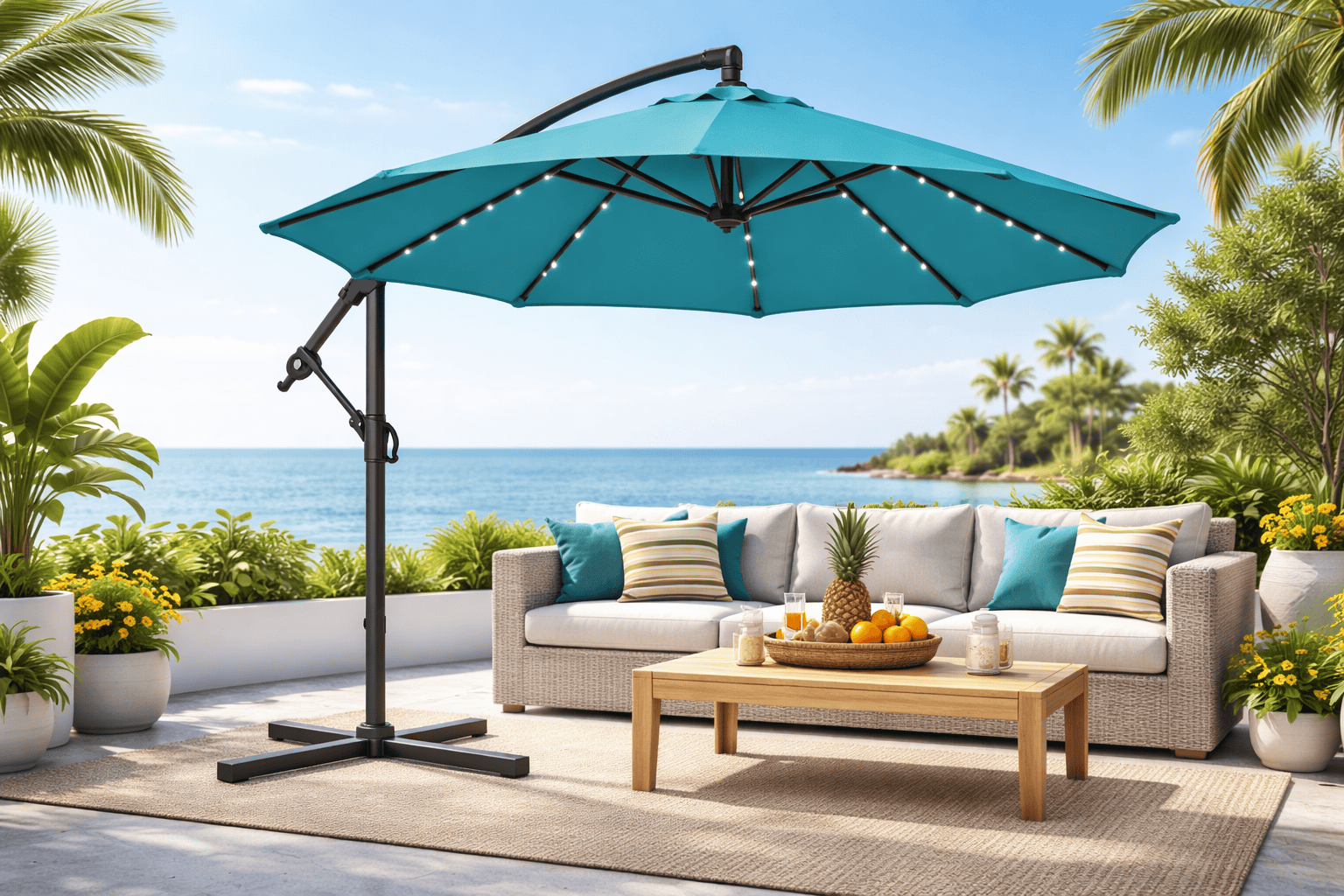This 300cm outdoor cantilever umbrella is designed to provide flexible shade for patios and outdoor living areas.